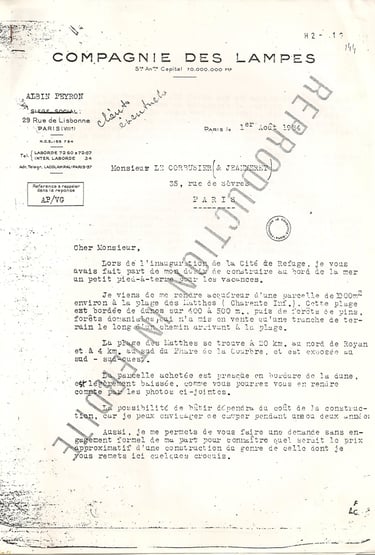 La première lettre que Albin Peyron adresse à Le Corbusier est sur un papier à en-tête de la compagnie des lampes, société dans laquelle Albin travaillait. Elle date du 1er août 1934
