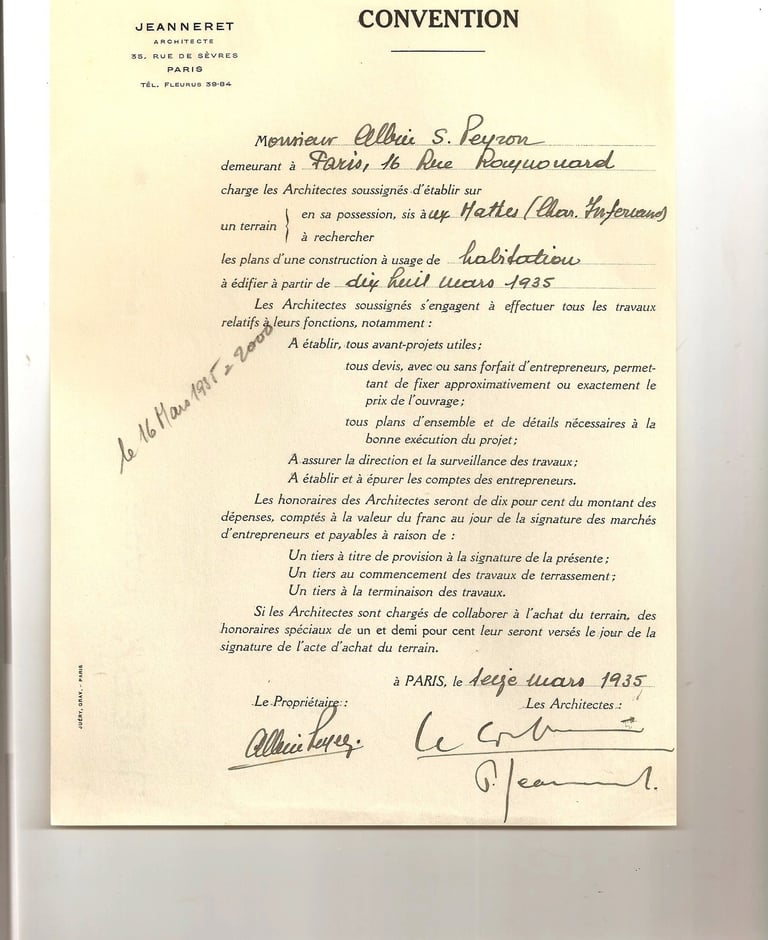 La convention entre Albin Peyron et Le Corbusier sera signée le 16 mars 1935.